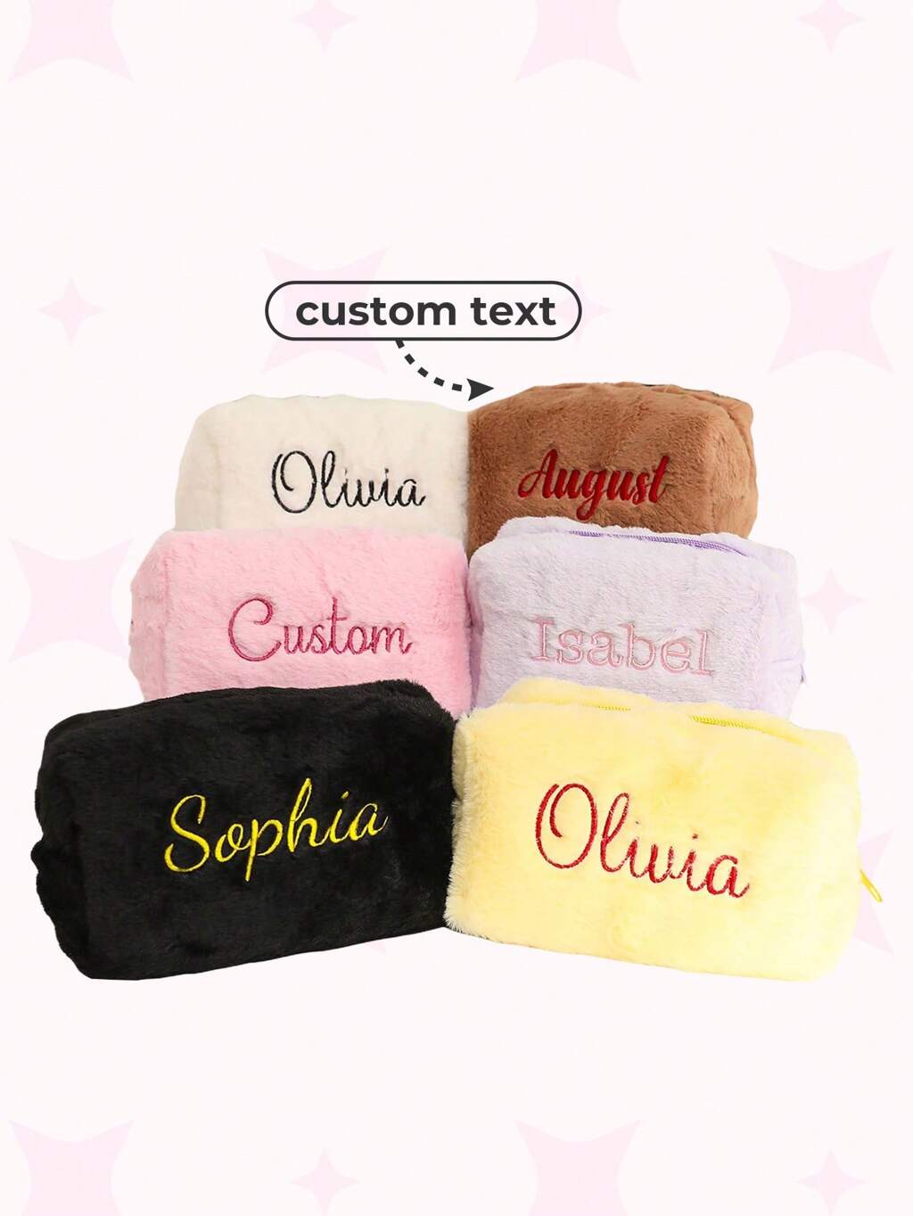 Custom Name Fur Makeup Bag, Personalized Fluffy Embroidery Cosmetic Bag, Custom Name Quilted Toiletry Pouch, Fluffy Zipper Travel Organizer, Unique Custom Makeup Wallet, Exquisite Soft Vintage Colorful Stylish Modern Cosmetic Bag, Lettered, Solid Color, Multi-Functional, Ideal Gift For Her, Girlfriend, Friends